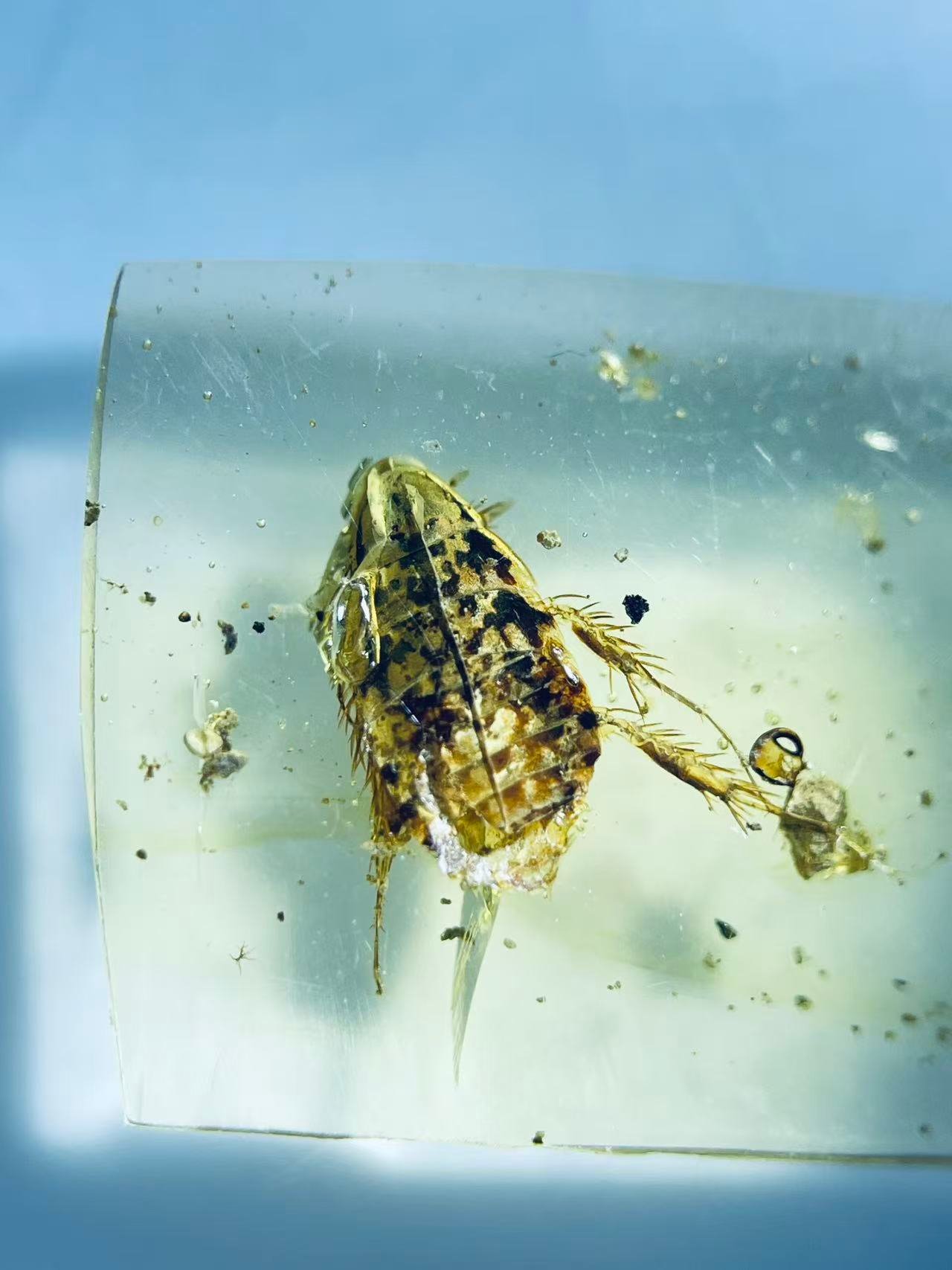 This piebald cockroach specimen has surface damage; please examine the image carefully.